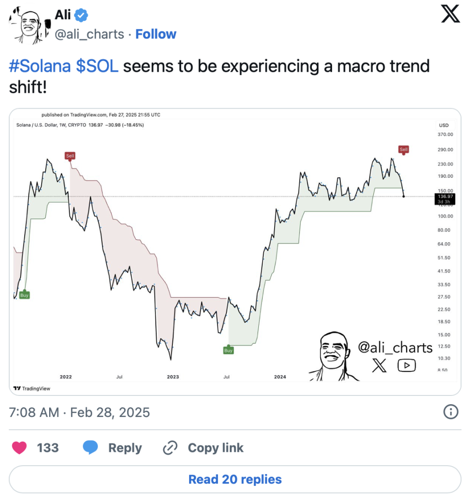 Noch deutlicher äußerte sich der bekannte charttechnische Analyst Ali Martinez. Er wies darauf hin, dass sich bei Solana aktuell eine Änderung des Makro-Trends andeutet, was einen Übergang von einer bullischen in eine bärische Phase bedeutet. In mehreren Posts auf X machte er darauf aufmerksam, dass der Durchbruch unter 130 US-Dollar bei Solana den Weg für einen Kursverfall bis auf 65 US-Dollar frei gemacht haben könnte – was vom aktuellen Niveau aus weitere 50 Prozent Abwärtspotenzial bedeuten würde.