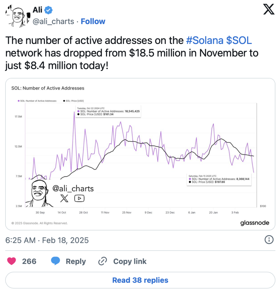Der Krypto-Experte Ali Martinez weist darauf hin, dass die Anzahl aktiver Adressen im Solana-Netzwerk von 18,5 Millionen im November auf aktuell 8,4 Millionen gefallen ist. Dieser drastische Rückgang signalisiert eine deutlich geringere Nutzung des Netzwerks und könnte auf ein abnehmendes Interesse oder reduzierte Transaktionsvolumina hindeuten.