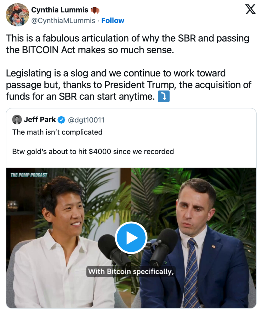 Der Bitcoin hat neue Rekordhochs erreicht, und während Anleger diese Entwicklung feiern, könnte bereits der nächste Kurstreiber in den Startlöchern stehen. Mit einem neuen Post auf X hat die Senatorin Cynthia Lummis auf sich aufmerksam gemacht und neue Details zur SBR (Strategic Bitcoin Reserve) der USA geteilt. So schrieb sie: „Die Gesetzgebung ist ein mühsamer Prozess und wir arbeiten weiterhin auf die Verabschiedung hin, aber dank Präsident Trump kann die Beschaffung von Mitteln für ein SBR jederzeit beginnen.”