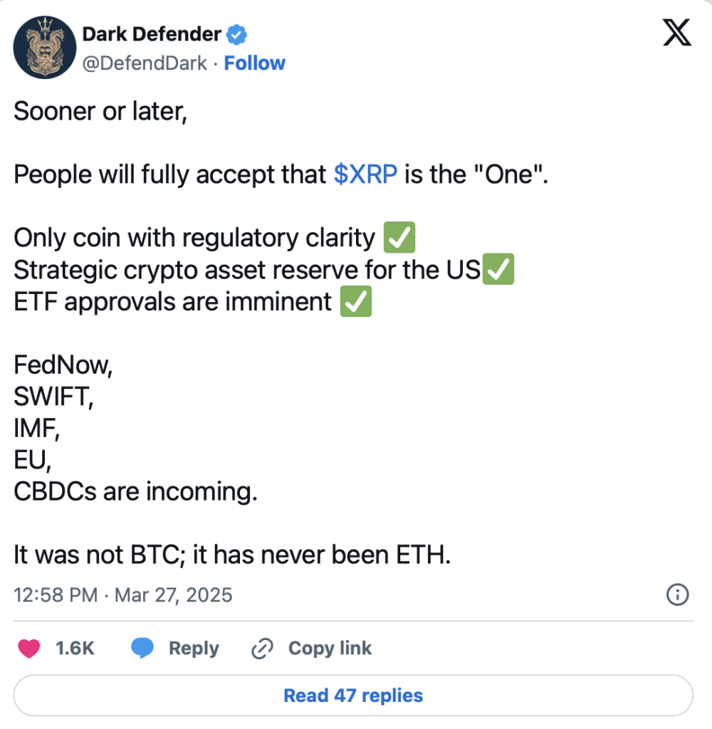 Nicht nur Bitwise zeigt sich optimistisch für die Zukunft von XRP. Auch der bekannte Analyst Dark Defender hat auf der Plattform X seine These bekräftigt, dass Ripple bald zur dominierenden Macht im Krypto-Sektor aufsteigen und sowohl Bitcoin als auch Ethereum bei der Marktkapitalisierung überholen könnte.
