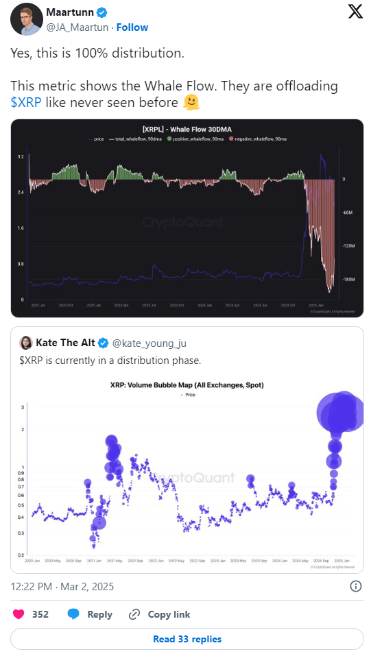 Die Analyse von Krypto-Experte Maartunn zeigt einen ungewöhnlichen Abverkauf durch große XRP-Inhaber. Diese Distribution, bei der Wale ihre Coins an kleinere Anleger abgeben, erzeugt typischerweise starken Verkaufsdruck und belastet den Kurs.