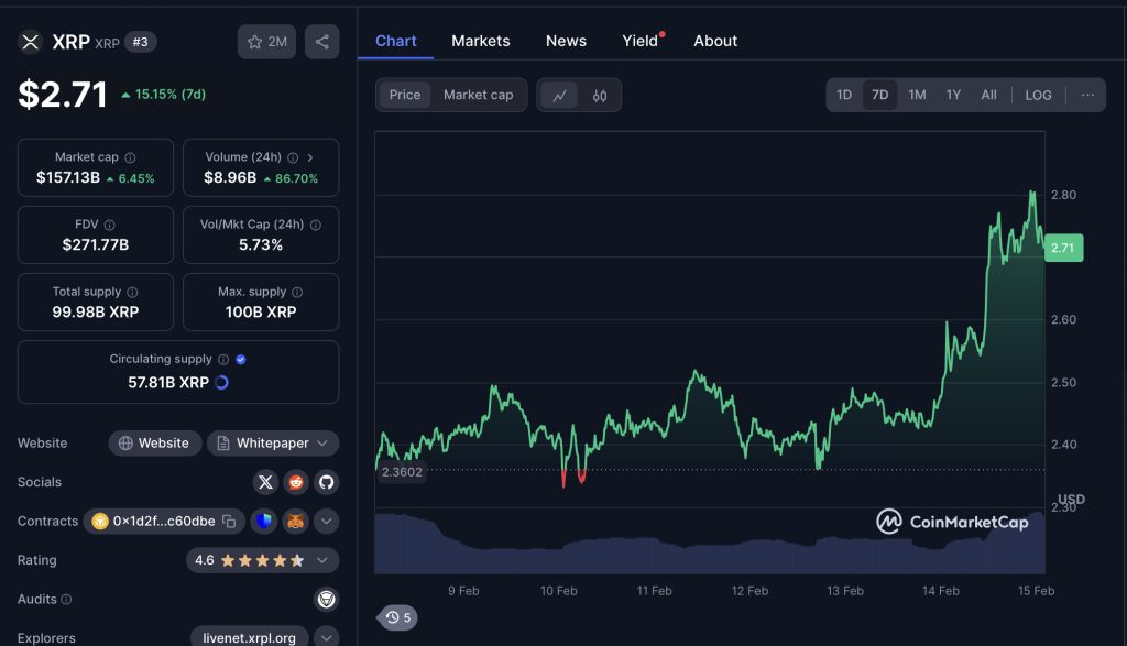 Dabei verzeichnet der kontroverse XRP-Token einen beeindruckenden Anstieg von über 15% in den letzten 7 Tagen. Unter den Top 10 Kryptowährungen wird diese Performance nur von BNB konkurriert, das ein wöchentliches Plus von 14% aufweist.