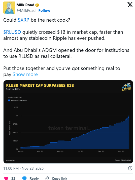 Der Ripple-Stablecoin RLUSD wächst in rasantem Tempo und hat die Marke von einer Milliarde US-Dollar Marktkapitalisierung schneller erreicht als vergleichbare Stablecoins. Gleichzeitig hat die Finanzaufsicht in Abu Dhabi institutionellen Investoren offiziell gestattet, RLUSD als vollständig reguliertes Sicherheiteninstrument zu nutzen.