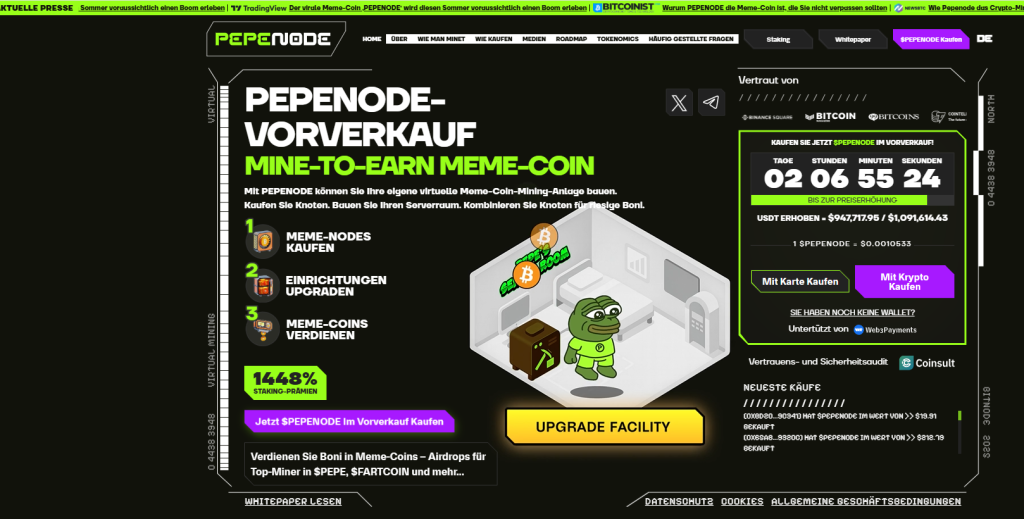 Das Projekt kombiniert spielerisches Mining mit einem aggressiven Burn-System – eine Mischung, die laut Experten langfristig für starke Preisanstiege sorgen könnte. Dennoch sollten die Risiken eines Memecoins immer in die betrachtung einbezogen werden – ein gesamtverlust ist genauso Möglich. In einem Umfeld, in dem Anleger zwischen Zinssenkungen, Rezessionssorgen und Krypto-Chancen hin- und hergerissen sind, präsentiert sich PepeNode dennoch als neuartige Alternative für den risikofreudigen Teil des Marktes.
